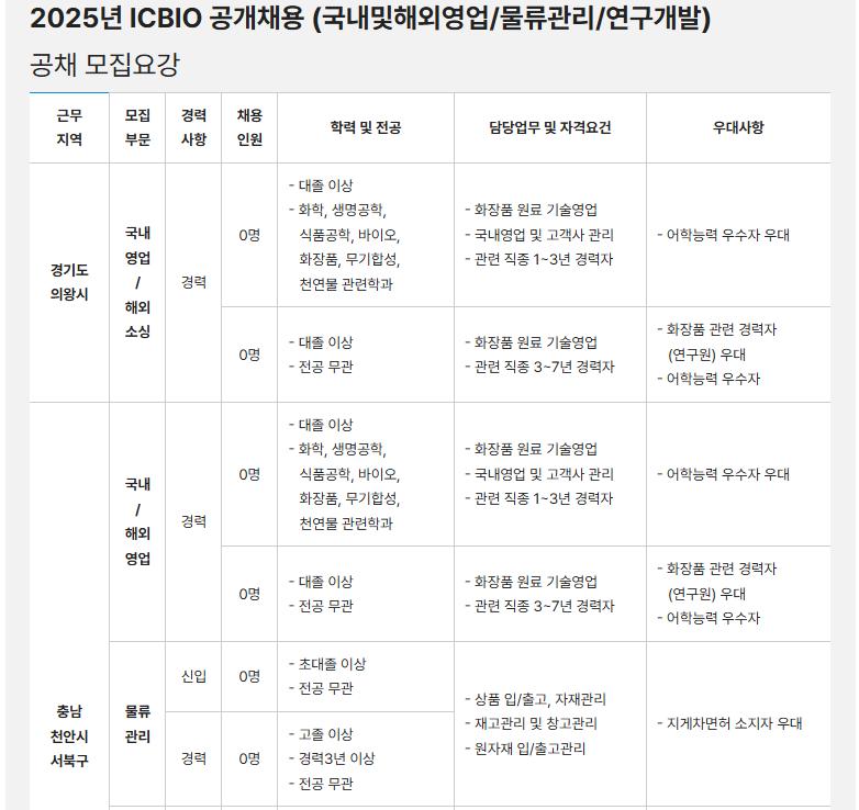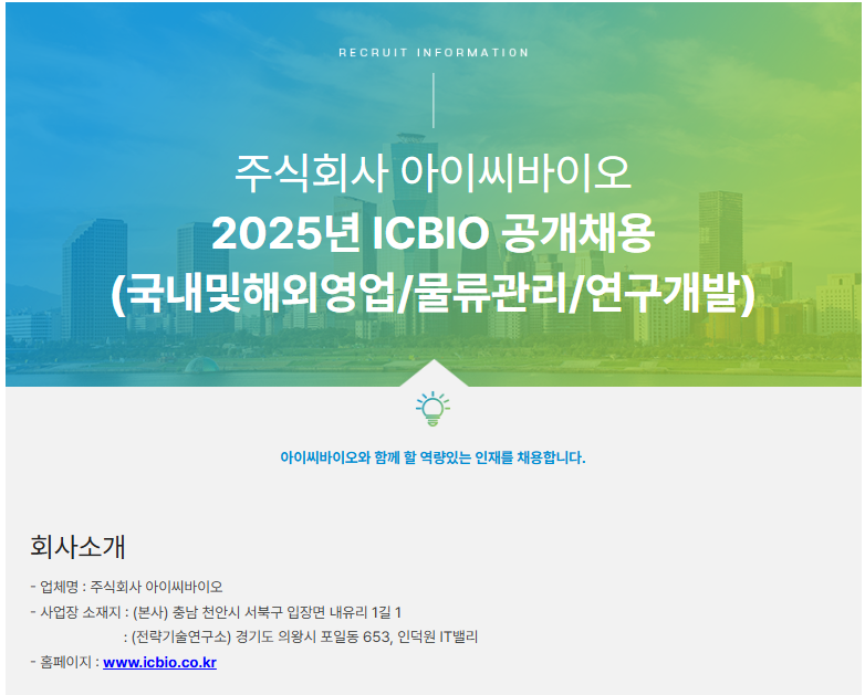 2025년 ICBIO 하반기 공개채용 (국내영업 및 해외소싱/물류관리/연구개발)
